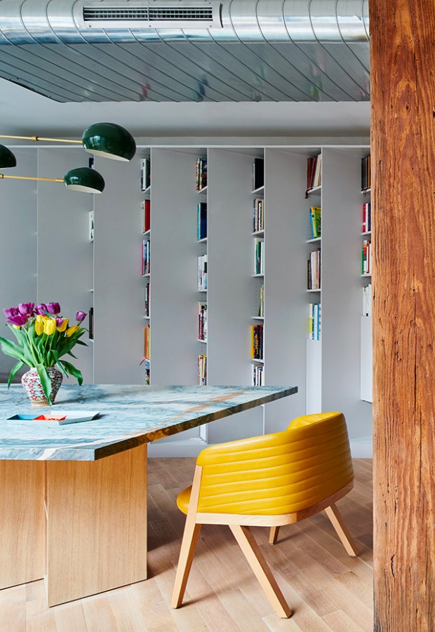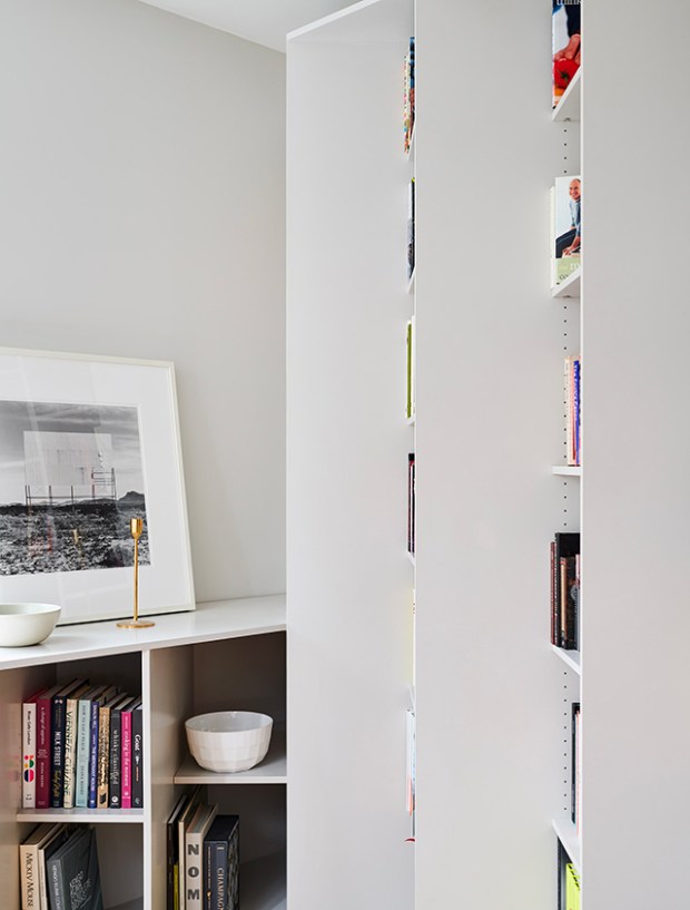 L’idée originale et particulièrement bien pensée des architectes réside dans cet angle de 45 degrés qui permet tantôt de cacher les livres et donc de les oublier, tantôt de les exposer fièrement et d’en faire le point focal de l’appartement.