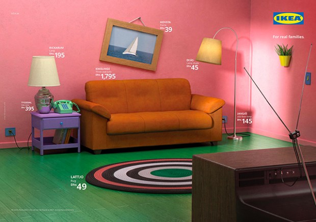 Comme souvent avec les publicités IKEA, la mise en scène évoque des intérieurs parfaitement fonctionnels avec des pastilles indiquant le nom du produit ainsi que son prix. Un travail de création aussi intéressant sur le plan publicitaire que sur l’approche décorative, les produits choisis dans le catalogue parvenant à être très fidèles à ceux des séries originales.
