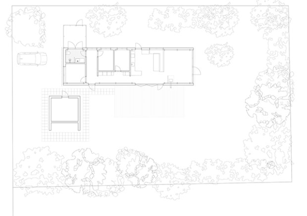 Petite touche d’originalité, l’organisation spatiale de la maison propose une approche relativement inhabituelle. Les pièces à vivre sont ainsi placées à l’étage de la maison, tandis que les chambres se trouvent au rez-de-chaussée. Ainsi, le vaste salon, la salle-à-manger et la cuisine revêtus de pin, bénéficie d’une vue plus dégagée sur la forêt. Des banquettes, un poêle à bois et le plan de travail de la cuisine divisent cet espace ouvert en définissant les zones fonctionnelles. Huit grands supports en acier longent la structure sur toute sa longueur et rythment l’espace.