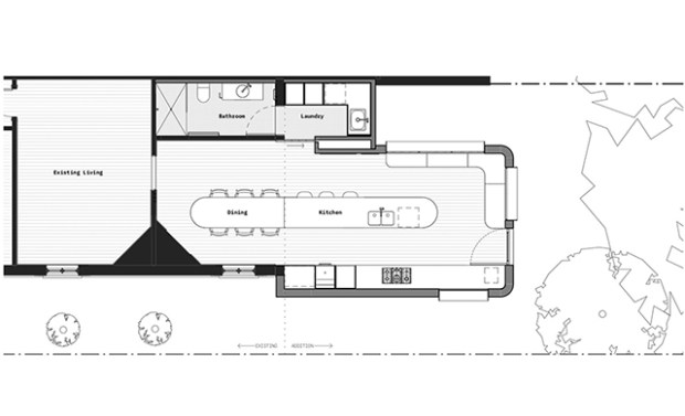 - Lorsque vous réalisez une extension, il faut trouver des astuces pour connecter les espaces. Ici, le rappel du terrazzo entre le plan de cuisine et la table à manger est idéal.