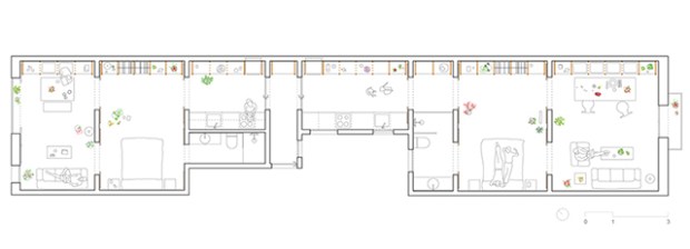 Avec de nombreuses portes de bois coulissantes, la composition des appartement apparaît alors comme dynamique et les pièces peuvent être complètement, partiellement ou non reliées les unes aux autres. Lorsque les portes sont fermées, chaque pièce est une entité en soi, tandis que lorsqu’elles sont ouvertes, chaque pièce est une entité à part et autonome. Sur le plan des rangements, une structure d’étagères court sur toute la longueur de l’espace, avec un système de rayonnage qui offre différentes fonctions au fil des pièces. Penderie, meuble télévision, grand banc, bibliothèque…