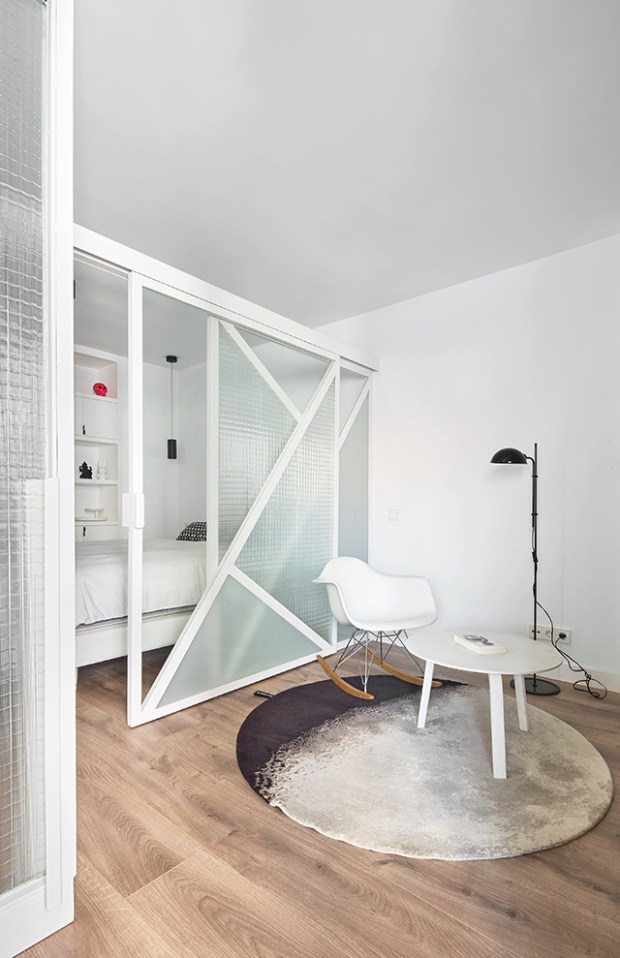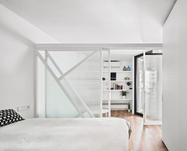 La chambre principale est séparée du salon par des portes coulissantes en verre combinant du verre mat, translucide et transparent dans un motif géométrique. Ces portes ont été pensées pour ne pas atteindre le plafond, le but étant d’offrir de l’intimité tout en laissant passer la lumière.