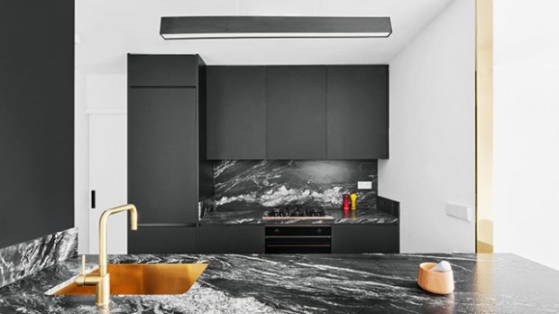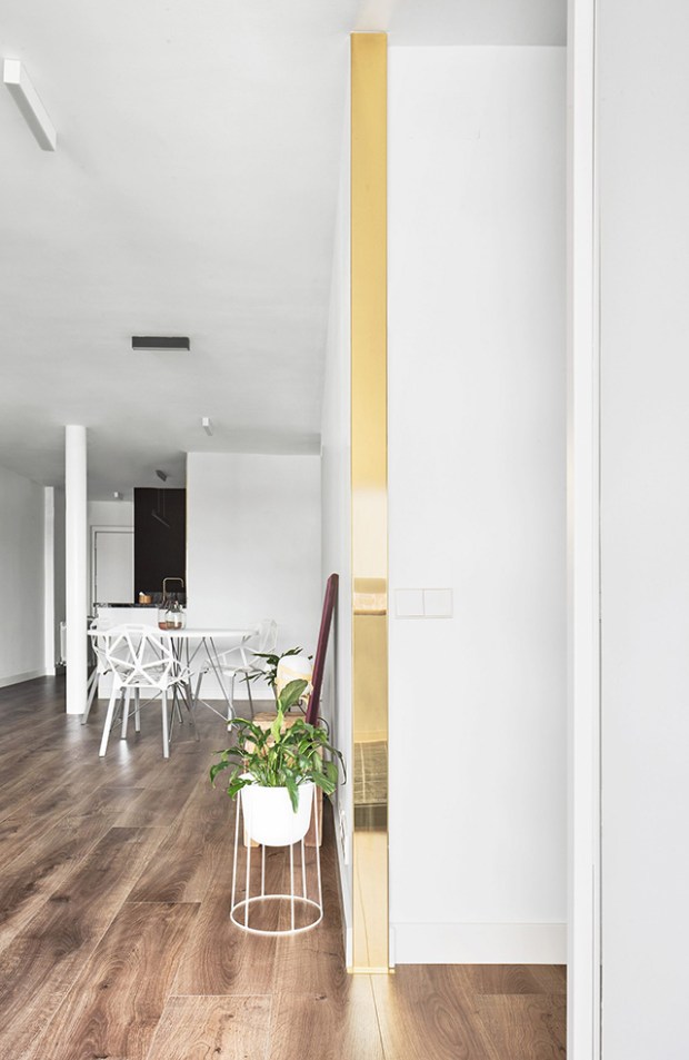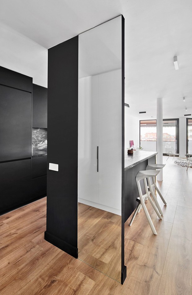 Pour délimiter l’espace de vie de la cuisine, c’est une palette de couleurs composée de noir et blanc qui est utilisée. La cuisine étant presque entièrement noire, avec d’élégantes finitions de laiton, elle se séparer visuellement de l’espace de vie qui lui est intégralement blanc. Au niveau de l’entrée de la cuisine, l’architecte a placé un grand miroir pour accroître le sentiment d’espace.