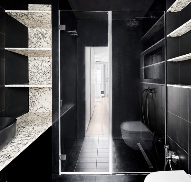 Le noir est également utilisé pour les encadrements de fenêtres et dans la salle de bains attenante, qui est principalement noire et réalisée en granit. Cette approche en bichromie se poursuit jusque sur la terrasse revêtue de carreaux ciment texturés et noirs.