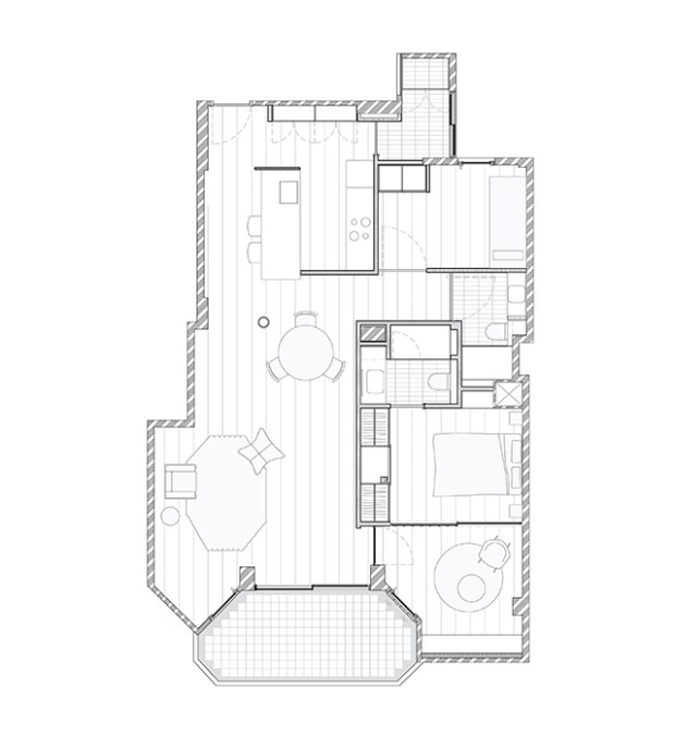 Une fois l’appartement mis à nu, notamment en supprimant l’ensemble des pièces, il a été divisé avec deux murs non structurels qui forment un L. L’idée était de définir la forme de la cuisine et séparer la chambre de l’espace principal. Une bonne idée puisqu’elles divisent l’intérieur mais permettent à l’appartement d’avoir un flux continu.
