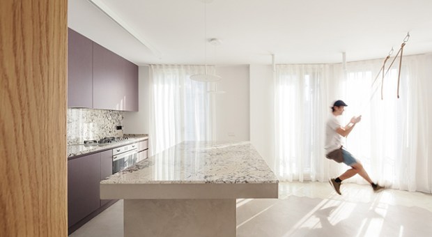 Enfin, dans la cuisine d’une très grande sobriété puisque monochrome, l’architecte a installé une balançoire, une idée très originale qui vient apporter une touche ludique à cet espace minimaliste.