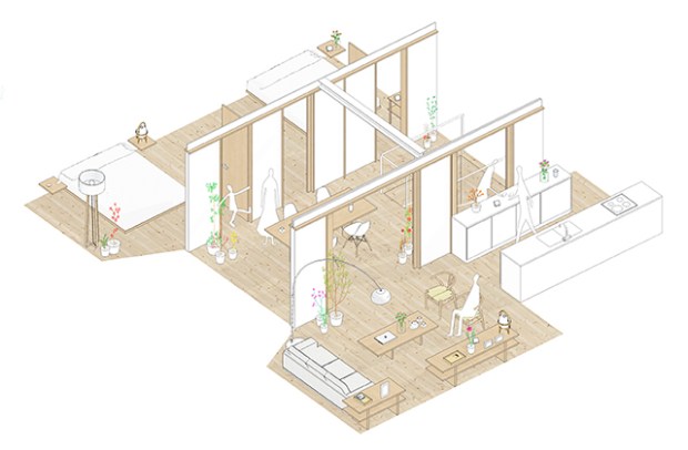 L’esthétique de cette décoration s’inspire des maisons japonaises traditionnelles. Des panneaux fixes et mobiles, qui nous rappellent les « fusuma », créent un paysage mouvant et fonctionnel. Ici les panneaux fixes sont en bois laqué blanc et les panneaux mobiles en bois naturel de châtaignier. La présence de ces éléments mobiles donne lieu à des frontières changeantes qui invitent la nature et la lumière à entrer dans l’habitation.