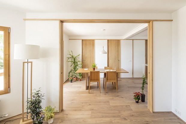 Au rez-de-chaussée, une nouvelle ouverture a été créée au moyen d’une poutre de renforcement structurel sur le mur porteur. Elle vient relier la terrasse et le jardin arrière à la salle à manger et à l’escalier. Cette intervention crée un nouvel espace interstitiel qui permet la création de deux cloisons modulaires en bois se faisant face, unifiant les différentes unités de la maison dans une composition spatiale flexible. Autour de toutes les portes et fenêtres, les architectes sont venus poser des cadres de bois, une idée simple qui permet relier les pièces les unes aux autres, mais aussi au jardin environnant. Une méthode simple pour augmenter virtuellement la profondeur dans l’espace.