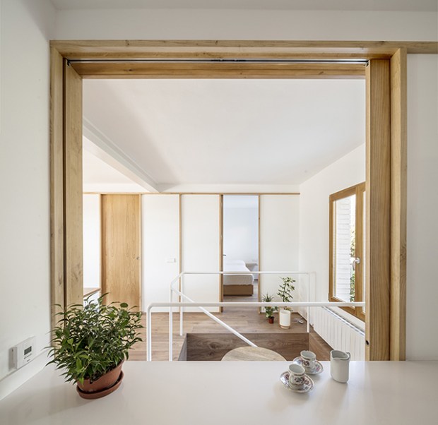 Pour démarrer avec ce projet qui dépasse les limites de la décoration, il faut avant tout signaler la prise de risque de l’architecte. Ajouter un étage en passant par la partie inférieure de la maison était une opportunité à saisir en raison de la situation topographique de cette maison. Ces ouvertures au sol donnent naissance à une nouvelle relation spatiale très fluide et flexible entre les étages. Les nouvelles pièces profitent ainsi de lumière et de ventilation pour accueillir trois chambres. Elles s’installent de part et d’autre d’une aire de circulation qui traverse l’espace depuis les cours extérieures exposées au sud jusqu’à l’escalier menant à l’étage principal.