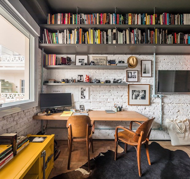 Des portes vitrées qui s’ouvrent sur un patio attenant et une série de grandes fenêtres laissent entrer la lumière naturelle dans l’espace de vie principal. La quasi-totalité du sol de l’appartement est recouvert de parquets, qui a été conservé et nettoyé lors de la rénovation. Parmi les autres éléments ajoutés, nous noterons ces étagères en métal qui viennent se fixer aux murs de briques blanches du bureau, et le papier peint très original installé comme tête de lit.
