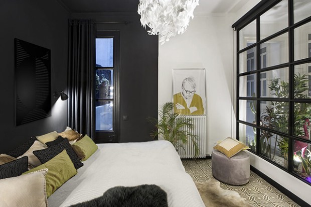 A l’inverse, dans la chambre, la bibliothèque et les salles de bains, on trouve une approche de la décoration bien plus contemporaine, avec beaucoup de noir, une atmosphère plus épurée et des touches déco très arty.