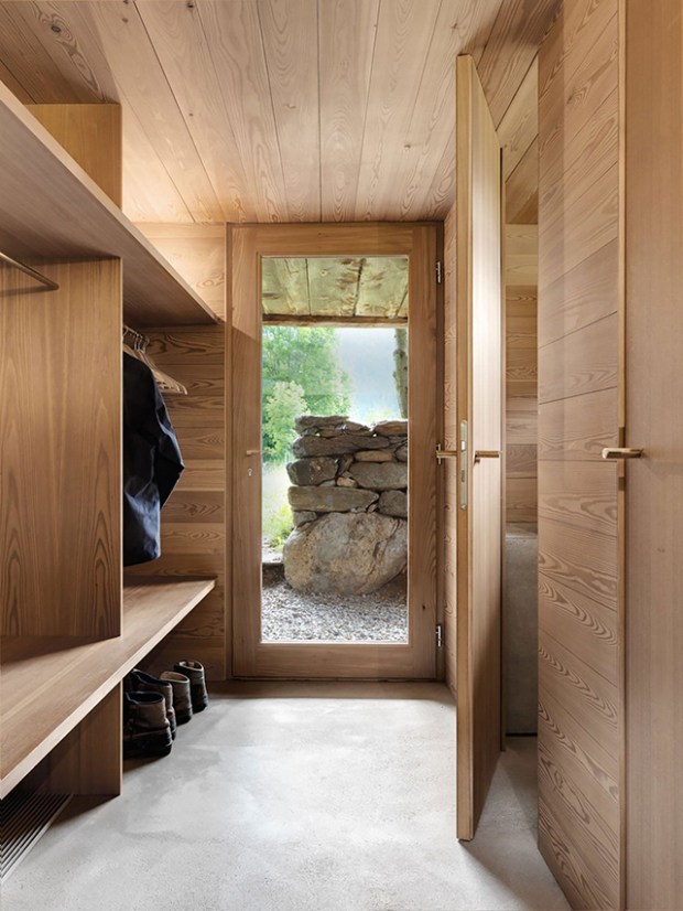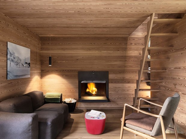 Avec son allure de chalet à l’abandon, son bardage de rondins de bois et le tuyau d’évacuation de poêle rouillé fixé à la va-vite sur le côté de la structure, cette petite cabane perdue en montagne à l’air tout sauf confortable. Il se trouve que c’est une ruse déployée par les architectes pour éloigner les curieux et préserver la tranquillité des occupants ! Une astuce plus qu’originale pour maquer l’intérieur très soigné et cosy de ce chalet très accueillant et bien pensé. Dans l’aménagement de l’espace, ce qui frappe, c’est la multitude de recoins et de points d’intérêts nichés dans une si petite surface.