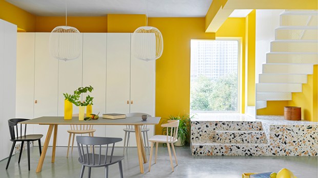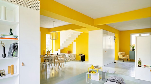 Partir sur une décoration majoritairement jaune est une sacrée prise de risque en décoration. Ici, dans cet espace en duplex de 300 mètres carrés, les architectes sont parvenus à créer de grands espaces de vie très ouverts et lumineux. Sur le plan spatial, l’étage inférieur abrite un salon, une salle à manger, une salle de jeux et une cuisine. Les chambres à coucher et les salles de bains se trouvent à l’étage supérieur, tandis que la grande terrasse sur le toit accueille un bureau à la vue imprenable.