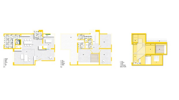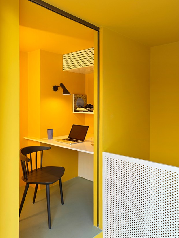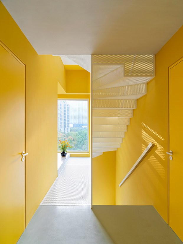 Ces deux étages sont rythmés par l’utilisation de peinture jaune vive qui est utilisée à la fois sur les murs et le mobilier encastré. Pour contrebalancer cette couleur éclatante, les décorateurs ont misé sur un sol de ciment et du mobilier en bois et en métal de couleur blanche. Une palette très énergique qui fonctionne très bien. Le cofondateur du studio, Momo Andrea Destro estime que « le jaune était la solution pour apporter une énergie positive dans la maison et conserver une certaine touche minimale avec les meubles et l’escalier blancs ».