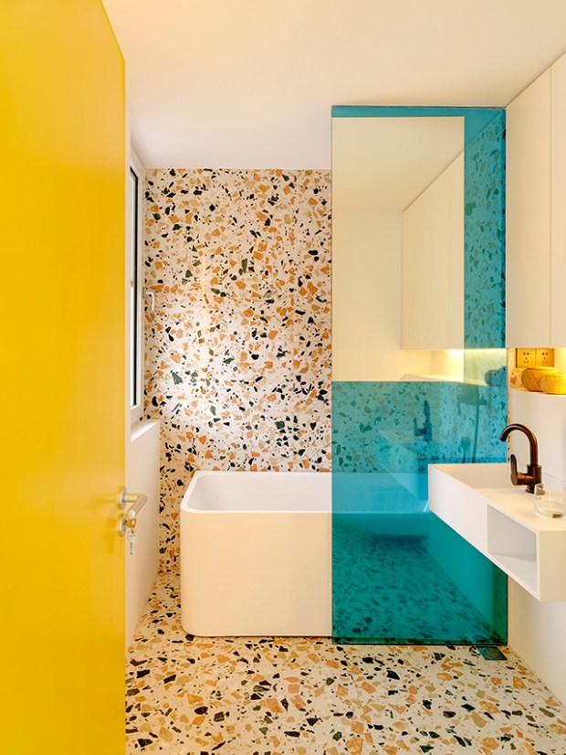- Jouez avec le terrazzo ! Pourquoi ne pas reprendre les tonalités de la pierre pour certaines pièces de mobilier ? Vous créerez ainsi une belle harmonie.