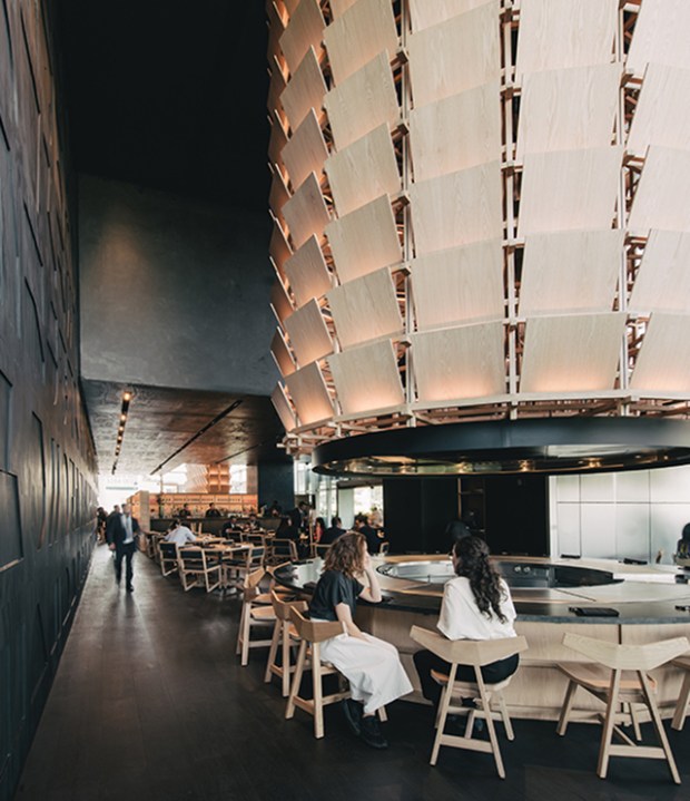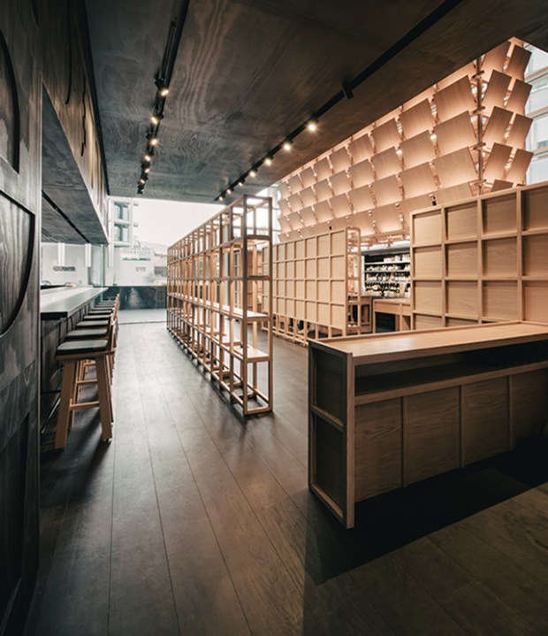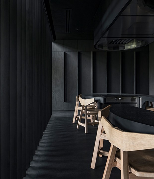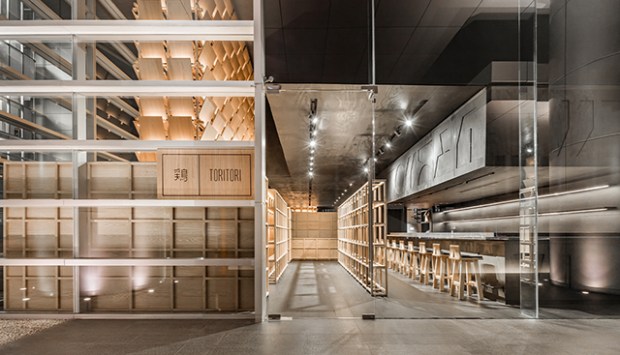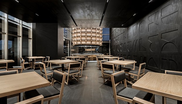 Cette intervention résonne que comme une ode à l’artisanat traditionnel japonais. Une ambiance calme et sereine se dégage de ce restaurant, mêlant grands volumes ouverts à des espaces plus intimes avec des plafonds bas. Globalement, le studio Esrawe a utilisé une palette cohérente de couleurs et de matériaux monochromes qui permettent de souligner le grand volume de l’espace. L’ensemble est sublimé par deux éléments en bois suspendus, qui renforcent l’impression d’espace lié à la hauteur sous plafond du lieu. Fabriqués en chêne, ces petits panneaux sont disposés de manière à se superposer pour créer une texture continue qui évoque l’image de l’armure des samouraïs, et en particulier le plastron, qui est connu en japonais sous le nom de « dō ». Non seulement décoratives, ces deux structures permettent de dissimuler les hottes d’extraction des cuisines. La décoration permet ici de joindre l’utile et l’agréable !