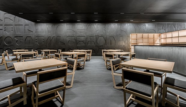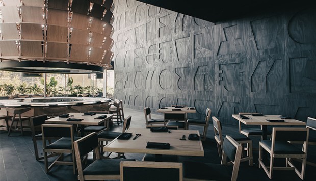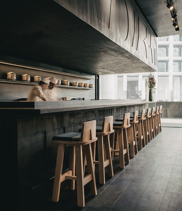Le mur principal, qui abrite le sushi bar, est tapissé de bas-reliefs conçus autour de la caractères kanji stylisés qui apportent une touche graphique à cet espace sublimé par un jeu d’éclairages très bien pensé.