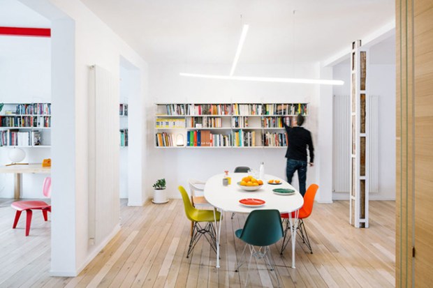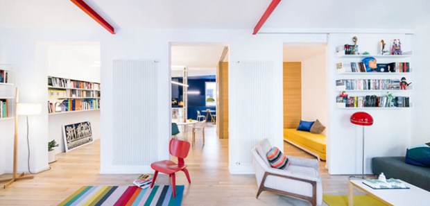 Ces zones s’enchaînent et succèdent grâce aux ouvertures amovibles du couloir. Ainsi l’espace peut totalement s’ouvrir ou se recroqueviller en fonction des besoins de son propriétaire. Pour relier les espaces, les architectes ont décidé d’utiliser le même parquet qui court sur l’ensemble de la surface, et ainsi les unifier. Le mobilier s’intègre parfaitement dans ces scénographies de la vie, avec des formes confortables et généreuses, quelques touches colorées apportées par des tapis ou des petits éléments de décoration.