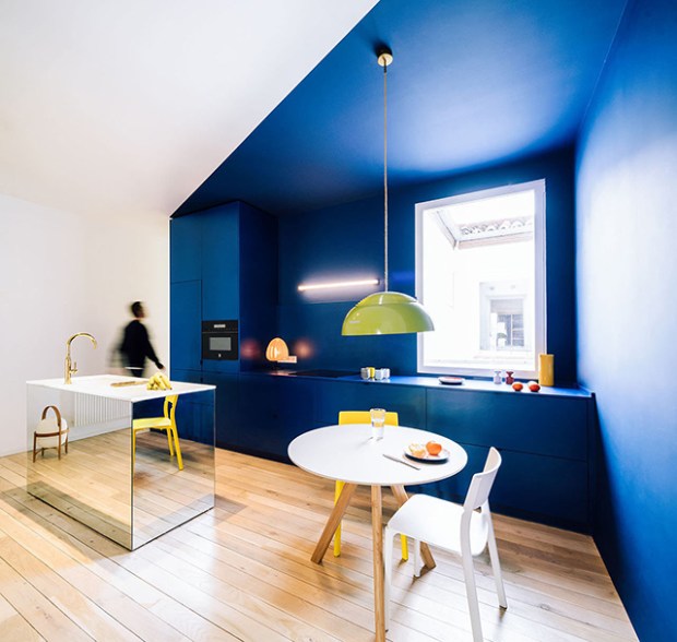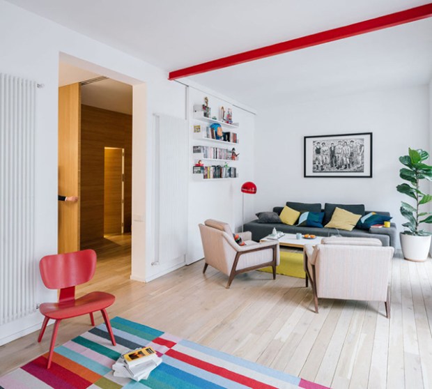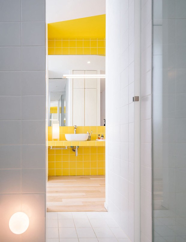 Si la salle de séjour peut être considérée comme l’élément central de l’appartement, c’est bien le traitement du couloir qui occupe la place centrale ici. Il permet de passer d’une pièce à une autre, chacune étant traitée à la manière d’un tableau, d’une scène. Ces scènes se rapportent toutes aux actions de bases de l’appartement comme cuisiner, dormir, se reposer, travailler, se nettoyer. Ces zones sont marquées symboliquement par des couleurs qui viennent faire pétiller la décoration.