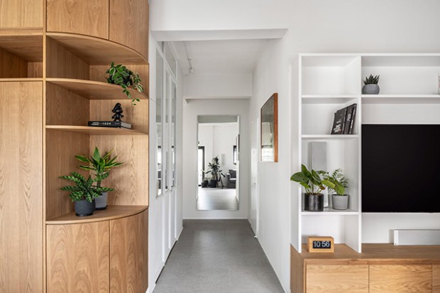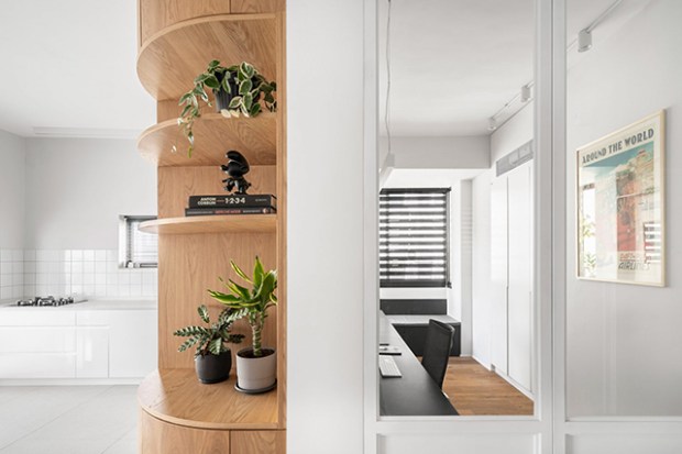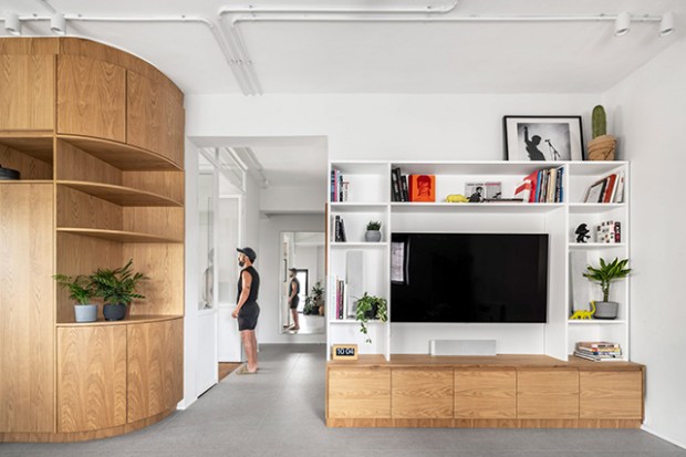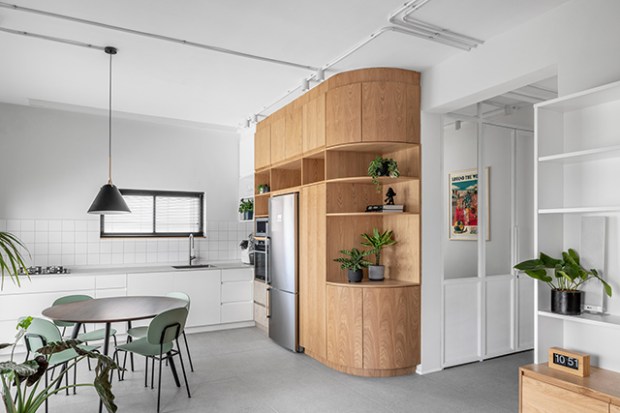 De nombreux éléments en bois s’invitent dans l’espace, notamment avec une armoire de cuisine en chêne qui dissimule le réfrigérateur et le four. L’originalité vient de son coin arrondi qui rejoint le couloir et embarque une série d’étagères et de rangements. Ces touches de bois contrastent avec les détails industriels, comme un mur en béton apparent dans le salon et les systèmes électriques au plafond. Le studio a laissé ces éléments exposés afin de conserver la hauteur sous-plafond de l’appartement.
