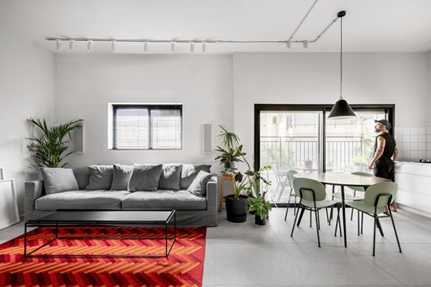 Divers revêtements de sol apportent une profondeur visuelle à l’ensemble de l’appartement, qui se caractérise par des surfaces blanches et des cadres de fenêtres noirs. La décoration participe elle aussi à ce mélange des genres. On pense notamment au tapis rouge et éclatant qui marque clairement la zone du salon en attirant le regard tout en y apportant la dose de confort nécessaire à cette espace de repos et de détente.