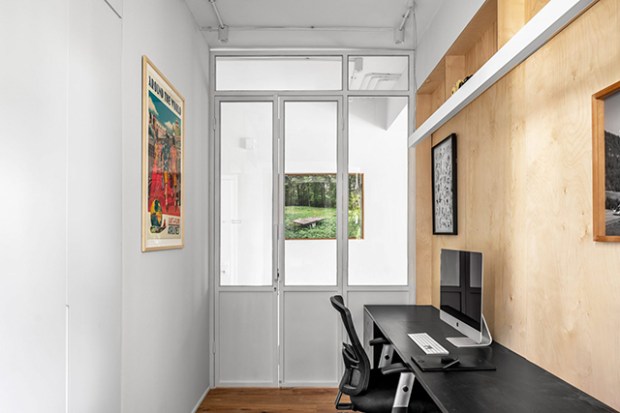 En pénétrant dans l’appartement, le visiteur est accueilli par un couloir en forme de L qui donne accès à un bureau. Cette pièce a été faite sur mesure par Rust Architects. Elle est entourée d’un élégant cadre métallique avec des portes en verre. Cette cloison permet à la lumière naturelle de passer dans le couloir et de circuler dans l’appartement.