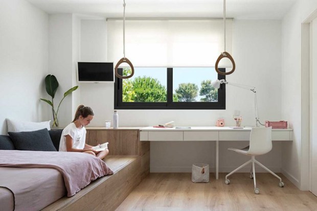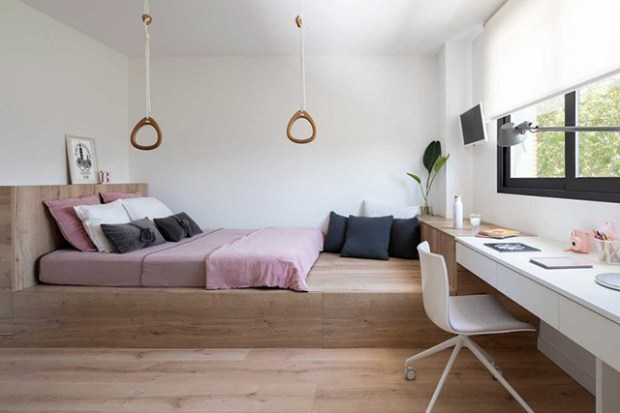 Le dernier étage abrite la chambre parentale à la disposition ouverte, donnant sur un coin bureau. Ici, comme dans toute l’habitation, des couleurs discrètes sont associées à des bois clairs pour apporter une impression de confort et de détente. Dans tout le projet, on ressent la volonté de l’architecte d’instaurer un design minimaliste guidé par la nature.