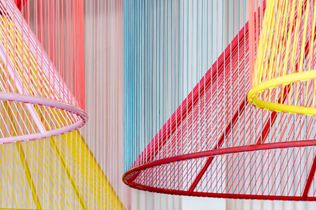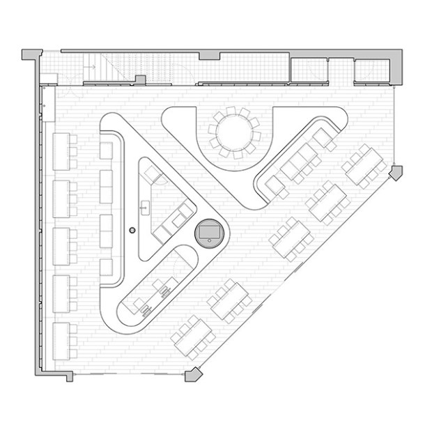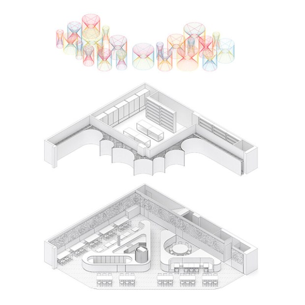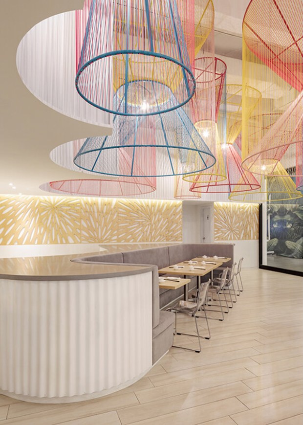 Voici une intervention très originale et réussie qui tire habilement profit de l’espace à double-hauteur du restaurant. La salle est organisée autour de grands îlots triangulaires avec des banquettes intégrées. Globalement, c’est tout le projet qui s’articule avec des formes géométriques simples : des cubes, des cylindres, des triangles… Le plan du restaurant lui-même est triangulaire. Un gros travail a été effectué au niveau du plafond, notamment avec l’ajout d’une multitude de lustres colorés et ludiques.