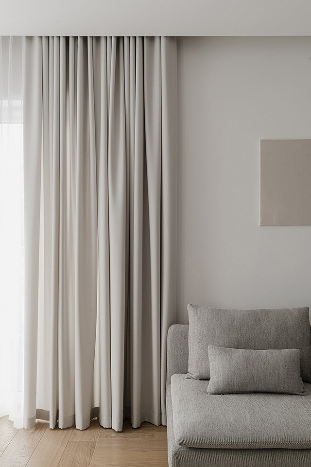 Les architectes sont aussi parvenus à éviter un problème récurrent lorsque l’on aménage un intérieur totalement ouvert : en l’absence de murs, l’ensemble peut facilement sembler froid. Pour cela, les architectes ont bien compris qu’il fallait contrebalancer cette impression en y ajoutant des textures douces et des couleurs chaudes. Des sols en bois de couleur beige clair sont utilisés partout, équilibrant l’ensemble composé de murs blancs et d’armoires sombres. Des rideaux démesurés se placent devant chaque fenêtre, apportant la douceur d’une présence de textile. Enfin, les luminaires en laiton et les meubles en bois apportent une chaleur supplémentaire.