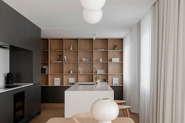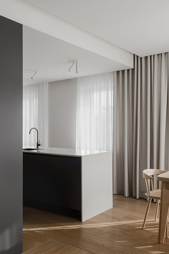 Les architectes sont aussi parvenus à éviter un problème récurrent lorsque l’on aménage un intérieur totalement ouvert : en l’absence de murs, l’ensemble peut facilement sembler froid. Pour cela, les architectes ont bien compris qu’il fallait contrebalancer cette impression en y ajoutant des textures douces et des couleurs chaudes. Des sols en bois de couleur beige clair sont utilisés partout, équilibrant l’ensemble composé de murs blancs et d’armoires sombres. Des rideaux démesurés se placent devant chaque fenêtre, apportant la douceur d’une présence de textile. Enfin, les luminaires en laiton et les meubles en bois apportent une chaleur supplémentaire.