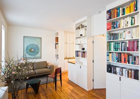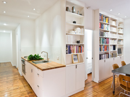Située dans le centre de New York, ce petit appartement a été entièrement rénové par l’agence Manifold Architecture Studio (Philipp et Kit von Dalwig). Il a pour pièce maîtresse une cloison fonctionnelle, intégrant la cuisine et divers rangements.