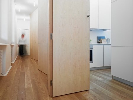 Dans cet appartement situé à Madrid, en Espagne, l’architecte Alfredo Sirvent a imaginé un couloir modulable, composé d’un ensemble de portes et de panneaux coulissants en bois.