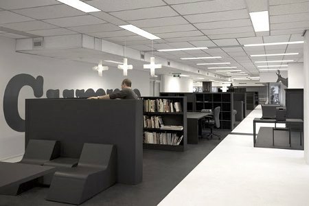 Pour aménager les locaux de la société de publicité Gummo, l’agence d’architecture hollandaise i29 a imaginé un intérieur traversé par une bande uniformément grise et légèrement texturée, sur laquelle se répartissent différents bureaux et micro espaces (rangement, détente…). L’objectif de ce projet était d’aménager un espace assez banal avec un minimum de moyens. Pour cela, différents meubles ont été récupérés, puis tous ont été peints de la même couleur.