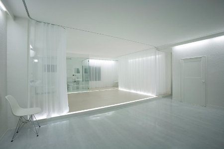 Matsugaya est un projet de rénovation d’un étage entier d’un immeuble situé dans le centre ville de Tokyo. Dépourvu de cloison, le lieu utilise un système de rideaux translucides pour permettre le partitionnement de l’espace, tout en favorisant une certaine unité visuelle.